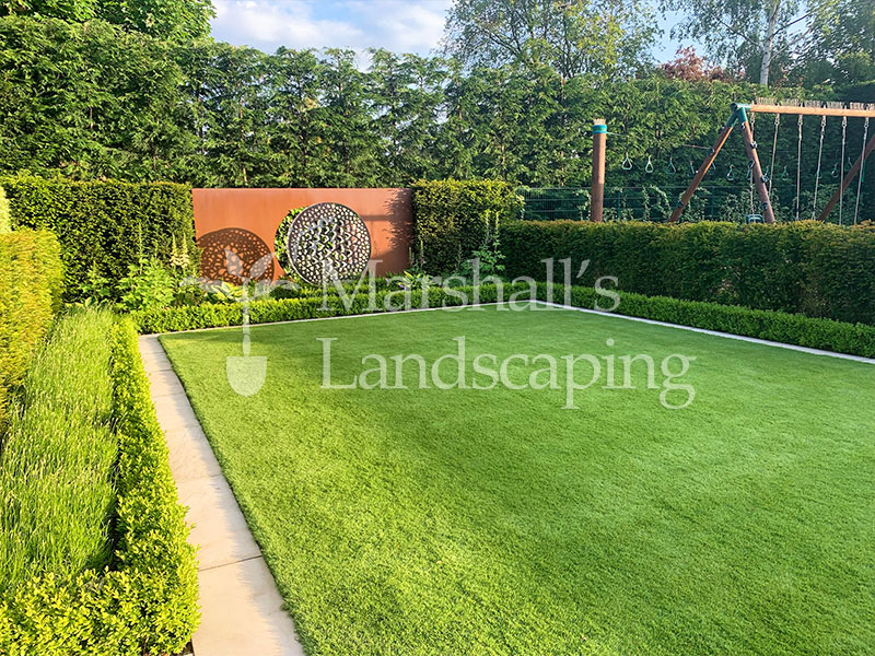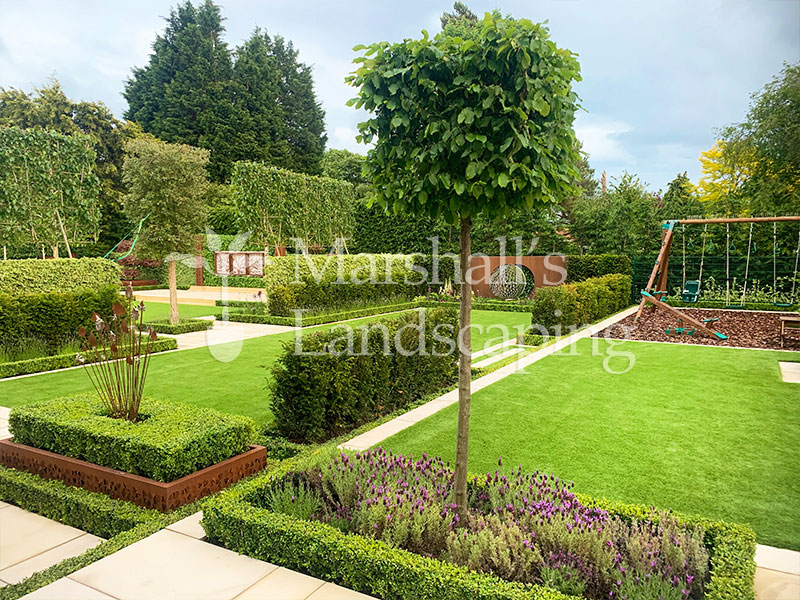 This contemporary family garden has been beautifully designed to balance clean, modern style with practical spaces for all ages to enjoy. The layout features crisp stone pathways and structured planting beds that define the space while keeping it easy to maintain. Lush green lawns offer plenty of room for play, complemented by a dedicated children’s area with a swing set and soft bark flooring – blending seamlessly into the overall design. Box hedging, lavender borders, and shaped trees bring colour, texture, and seasonal interest, while taller evergreens provide privacy and a sense of enclosure.