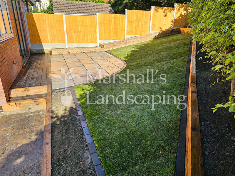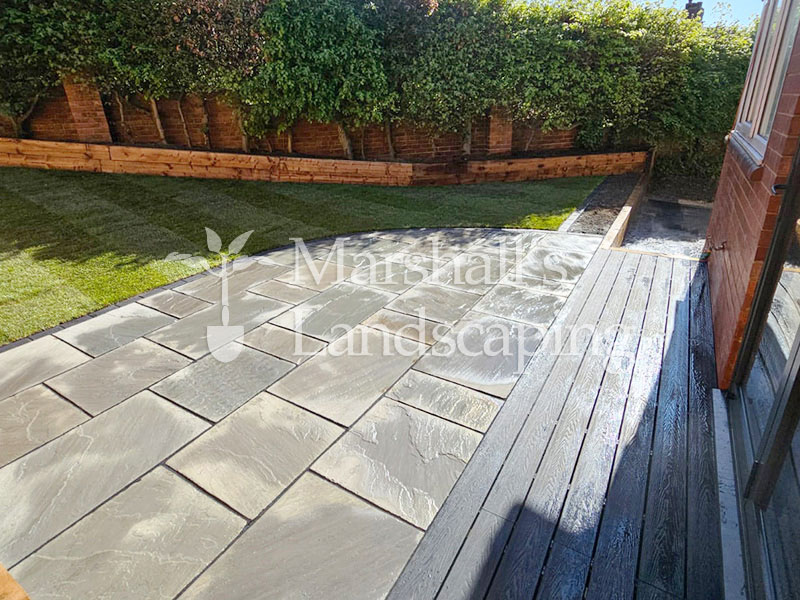 The layout features a modern sandstone patio in cool grey tones, creating a sleek and durable seating area that fits seamlessly into the garden’s shape. The raised lawn adds structure and depth, bordered neatly with timber sleeper edging for a polished finish and long-lasting strength.