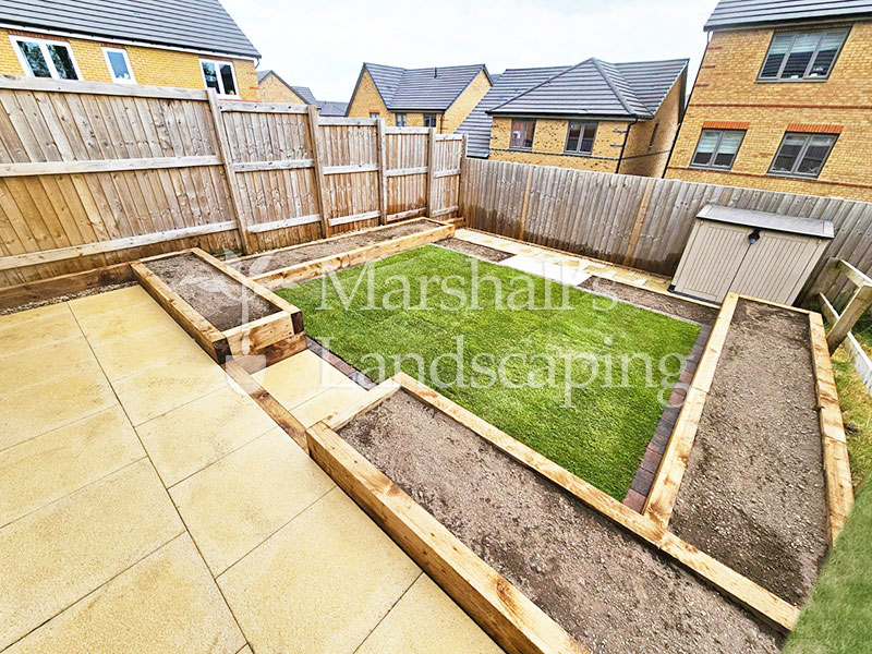 The project includes a series of timber sleeper retaining beds, carefully built to create a tiered layout that adds depth and structure while providing plenty of planting space for shrubs and flowers. These raised borders not only enhance the visual appeal but also make maintenance easier and planting more accessible.